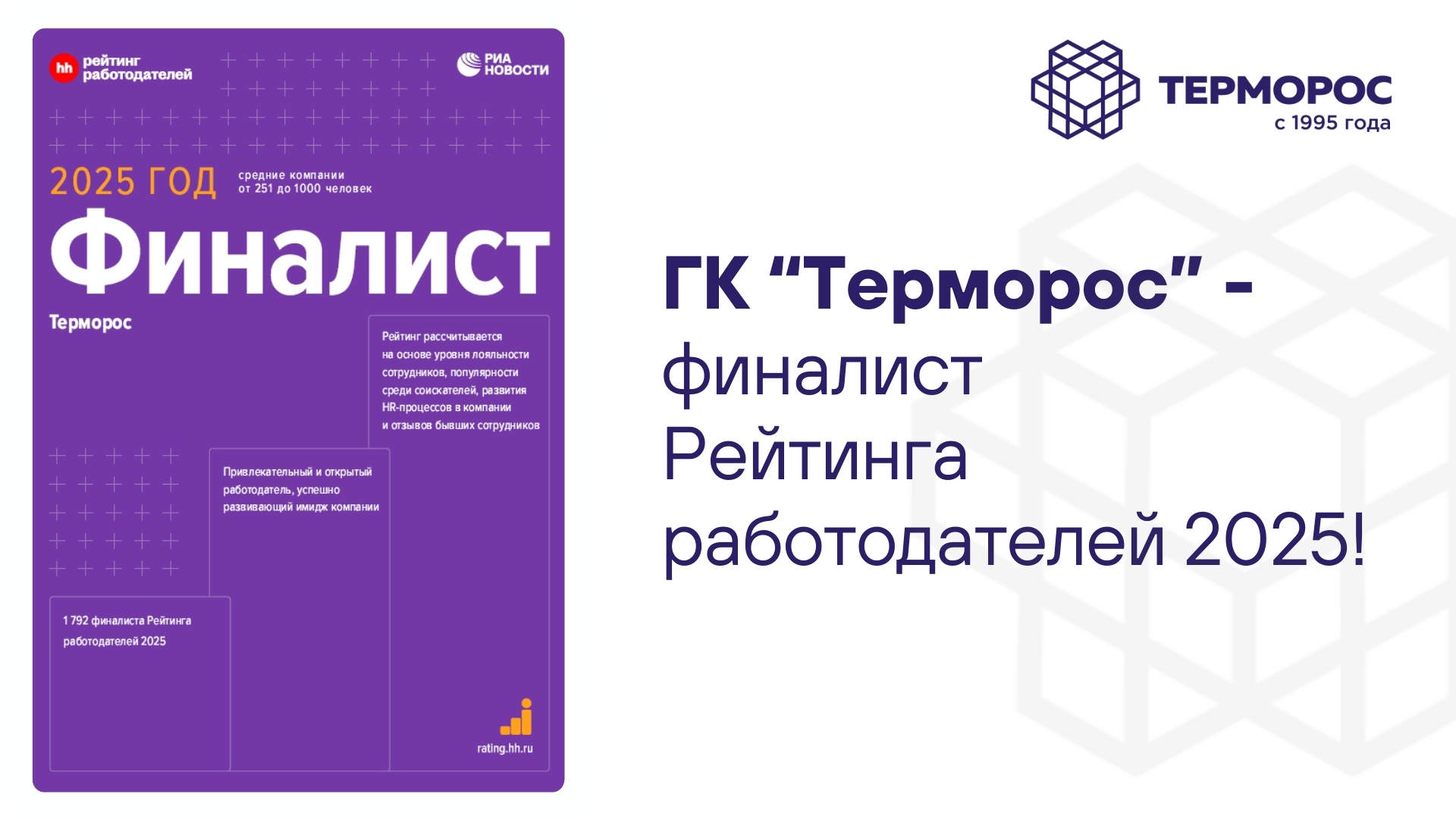 ГК «Терморос» второй год подряд становится финалистом престижного Рейтинга работодателей России, что подтверждает нашу репутацию на рынке труда.