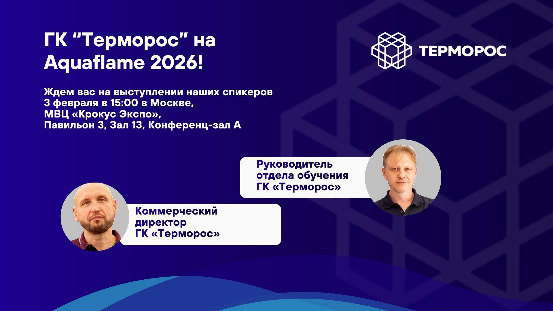 Коммерческий директор ГК «Терморос» Денис Лекомцев и руководитель отдела обучения Алексей Матвеев выступят 3 февраля на конференции, организованной журналом HeatClub в рамках международной выставки Aquaflame.